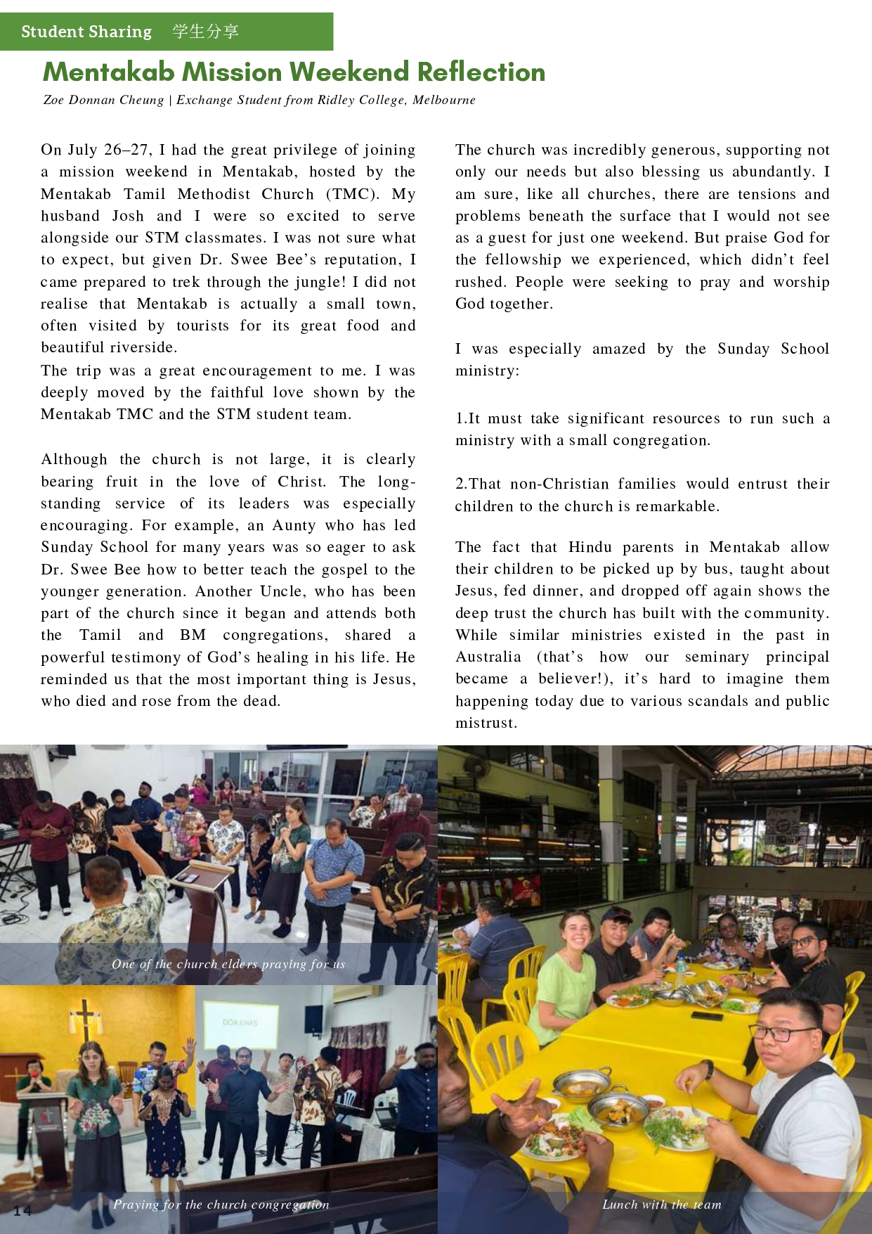 Mentakab Mission Weekend Reflection Posted On September 30, 2025 Zoe Donnan Cheung | Exchange Student from Ridley College, Melbourne Related Posts Menelusuri Dan Mengalami Kuasa Pencurahan Roh Kudus Di Bario Formation for Ministry Is Not an Easy Task, but STM Does a Brilliant Job 泰泽之旅 About The Author stmberita