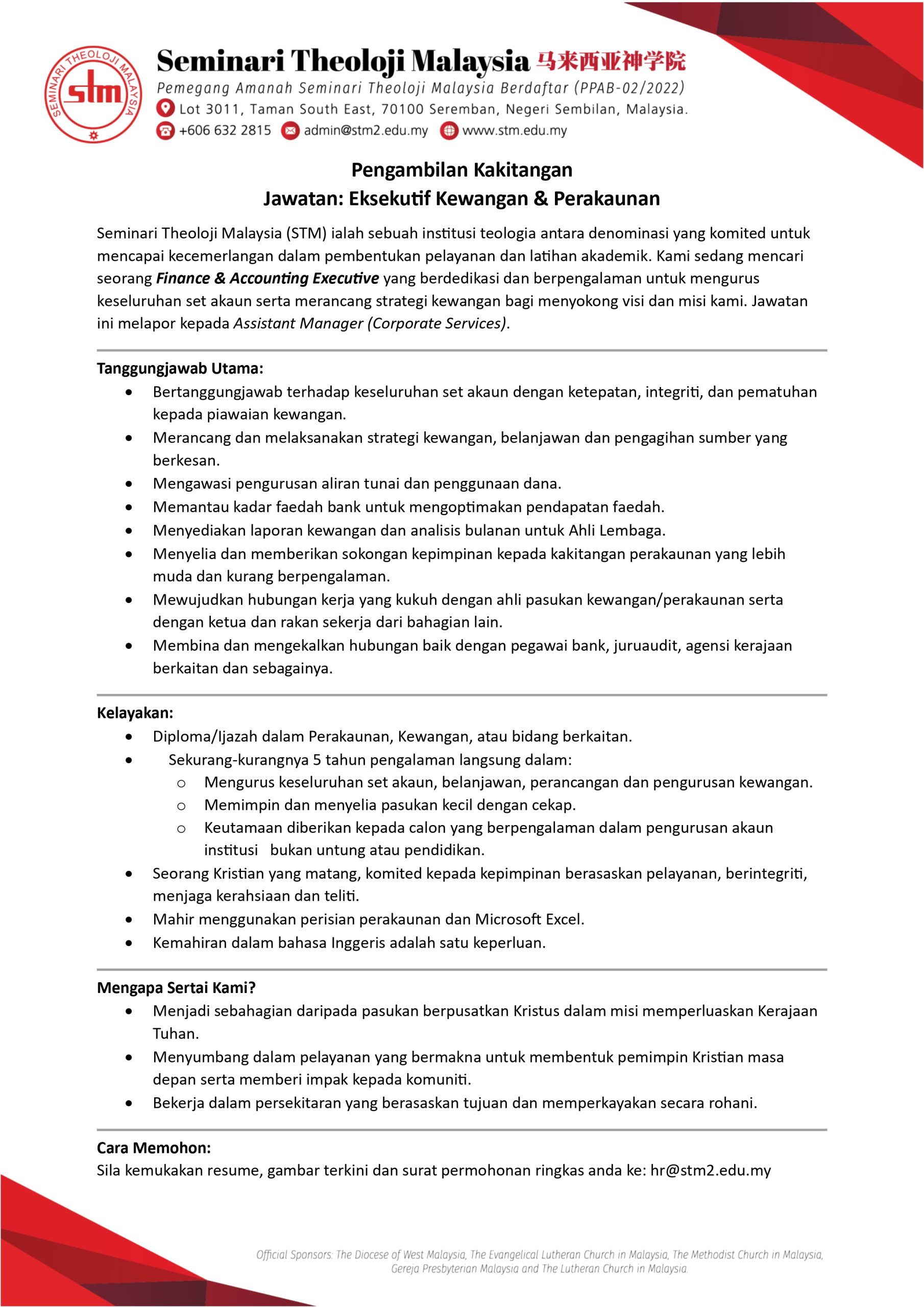 Sila kemukakan resume, gambar terkini dan surat permohonan ringkas anda ke: hr@stm2.edu.my