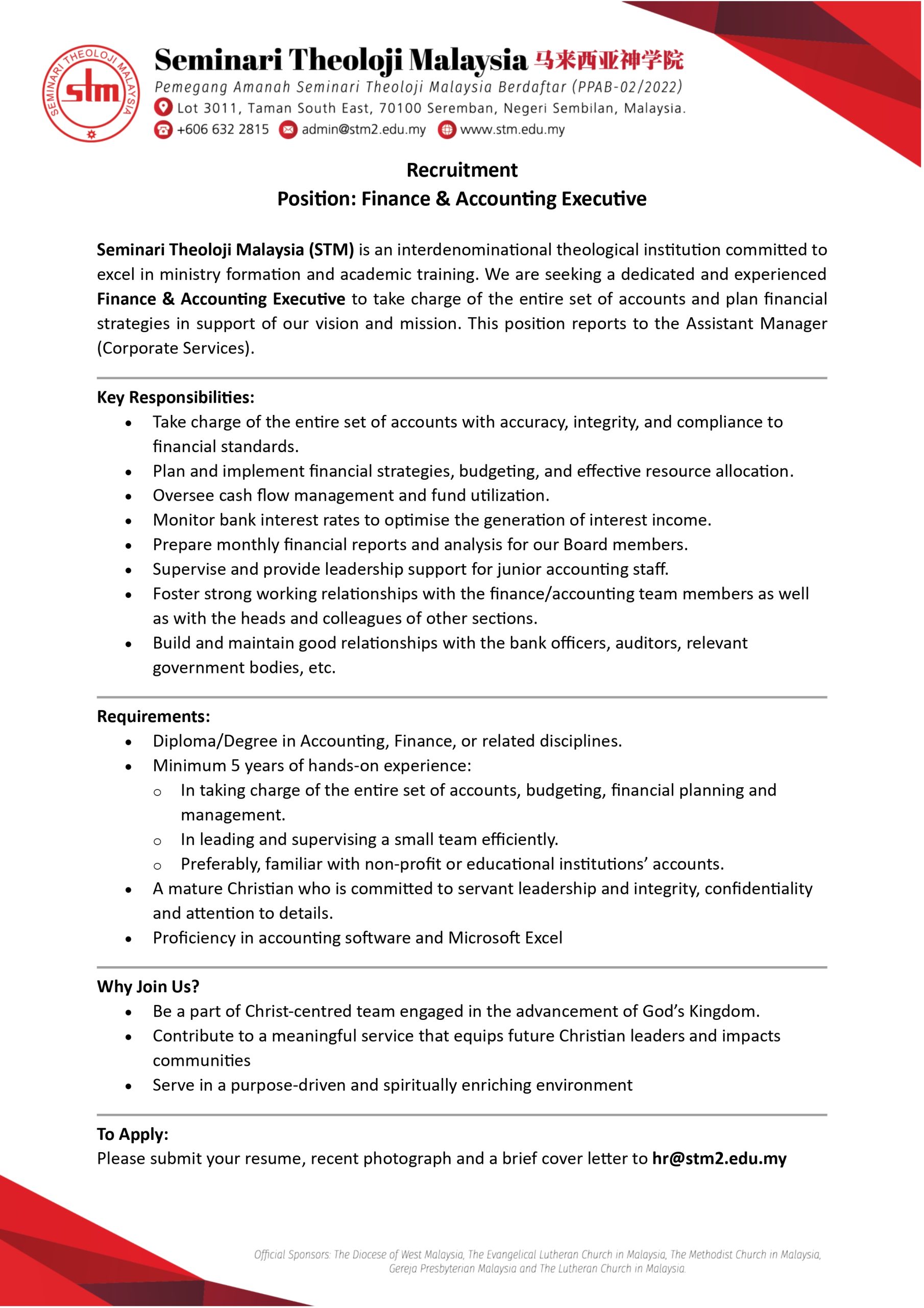 To Apply: Please submit your resume, recent photograph and a brief cover letter to hr@stm2.edu.my